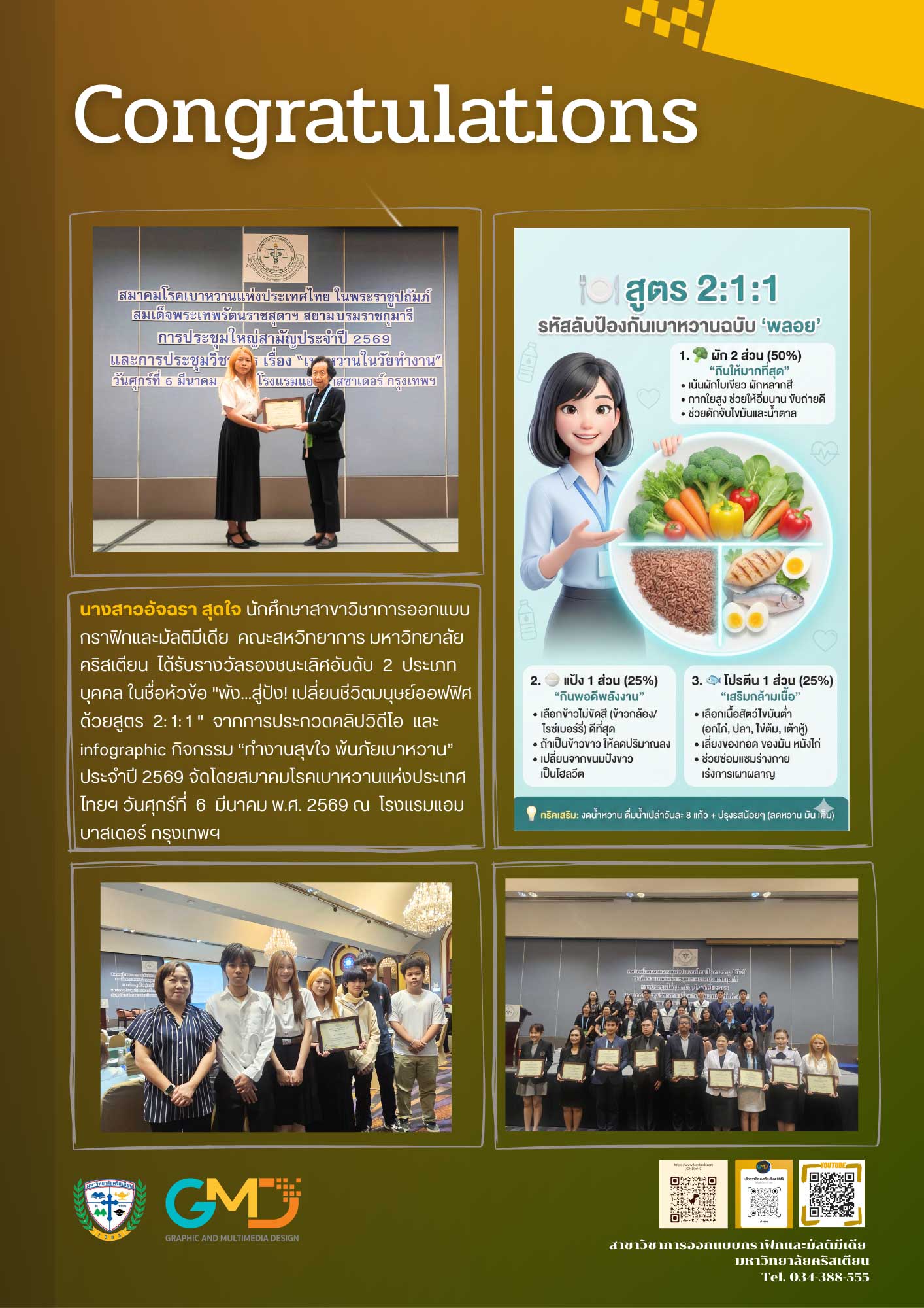 นางสาวอัจฉรา สุดใจ นักศึกษาสาขาวิชาการออกแบบกราฟิกและมัลติมีเดีย คณะสหวิทยาการ มหาวิทยาลัยคริสเตียน ได้รับรางวัลรองชนะเลิศอันดับ 2 ประเภทบุคคล ในชื่อหัวข้อ “พัง…สู่ปัง! เปลี่ยนชีวิตมนุษย์ออฟฟิศด้วยสูตร 2:1:1” จากการปรประกวดคลิปวิดีไอ และinfographic กิจกรรม “ทำงานสุขใจ พ้นภัยเบาหวาน”ประจำปี 2569 จัดโดยสมาคมโรคเบาหวานแห่งประเทศไทยฯ วันศุกร์ที่ 6 มีนาคม พ.ศ. 2569 ณ โรงแรมแอบบาสเดอร์ กรุงเทพฯ