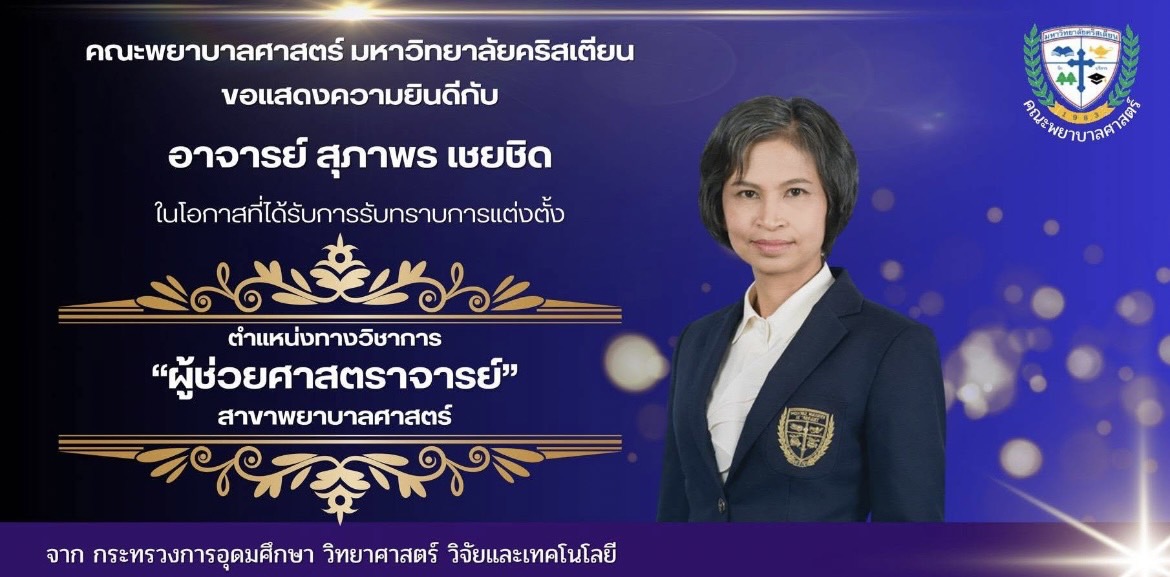 คณะพยาบาลศาสตร์ มหาวิทยาลัยคริสเตียน ขอแสดงความยินดีกับ ผู้ช่วยศาสตราจารย์ สุภาพร เชยชิด อาจารย์คณะพยาบาลศาสตร์ ที่ได้รับอนุมัติแต่งตั้งจาก กระทรวงการอุดมศึกษา วิทยาศาสตร์ วิจัยและเทคโนโลยี เป็น ” ผู้ช่วยศาสตราจารย์ ” สาขาพยาบาลศาสตร์ ขอแสดงความยินดีด้วยอย่างยิ่ง
