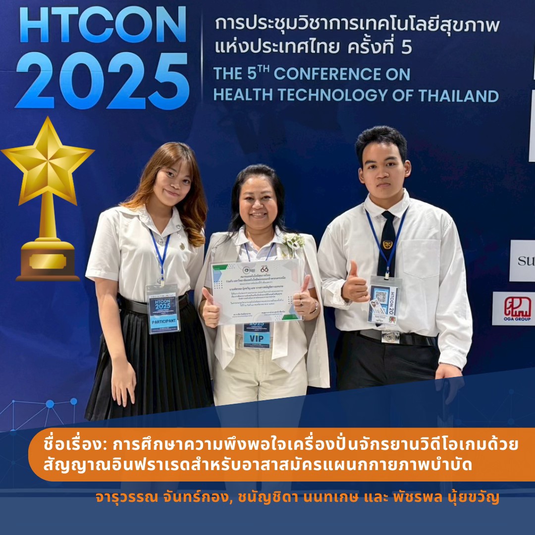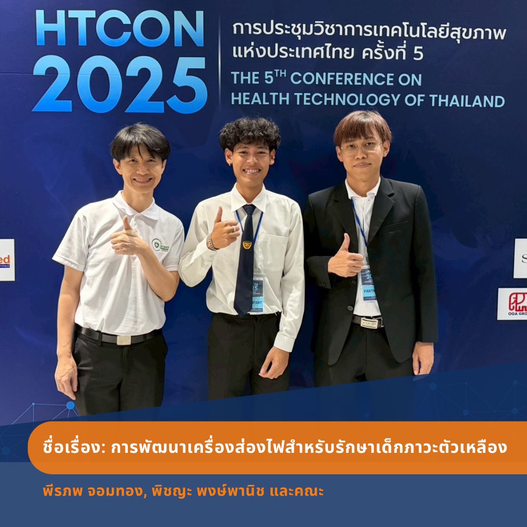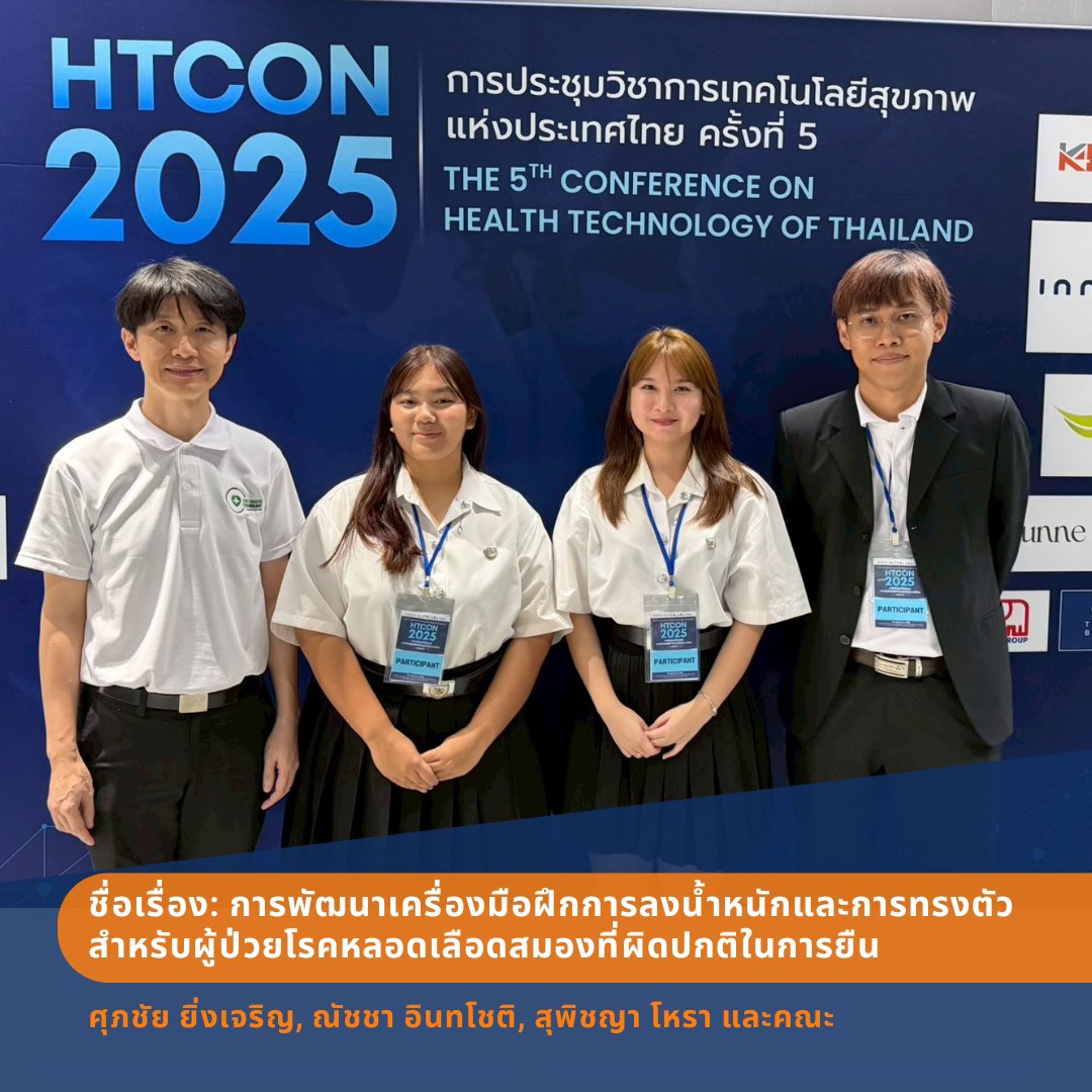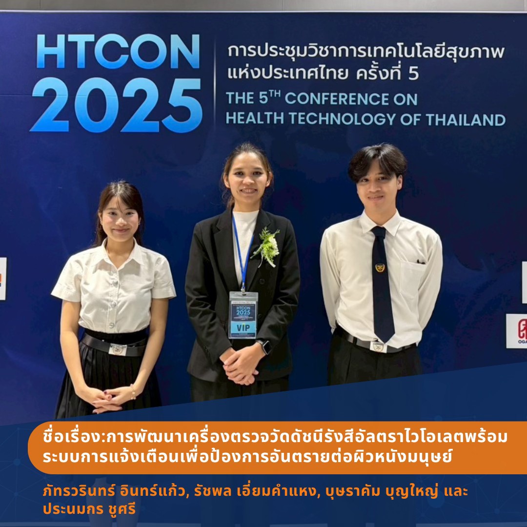 ในวันที่ 18 พฤศจิกายน 2568 นักศึกษาคณะวิทยาศาสตร์สุขภาพได้เข้าร่วมการเสนอผลงานวิจัยร่วมกับอาจารย์ที่ปรึกษา จำนวน 4 เรื่อง จากผู้ที่ร่วมส่งผลงาน 25 เรื่อง ในงานประชุมวิชาการเทคโนโลยีสุขภาพแห่งประเทศไทย ครั้งที่ 5 HTCON 2025 – The 5th Conference on Health Technology of Thailand จัดขึ้นโดยสมาคมเทคโนโลยีสุขภาพไทย ร่วมกับ มหาวิทยาลัยเทคโนโลยีพระจอมเกล้าพระนครเหนือ (มจพ.) ภายใต้หัวข้อ “AI and Medical Innovation” ณ อาคาร 99 อุทยานเทคโนโลยี