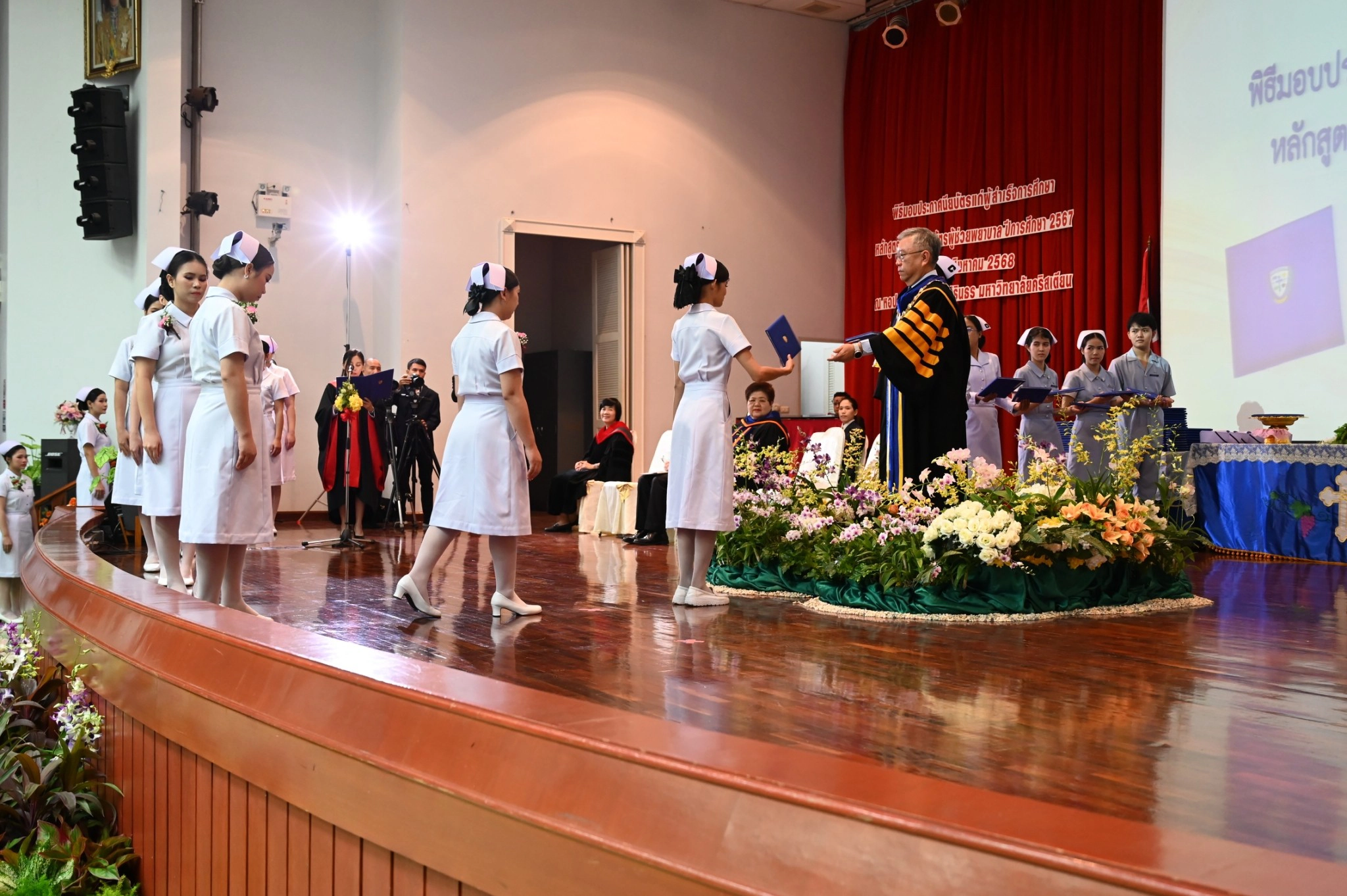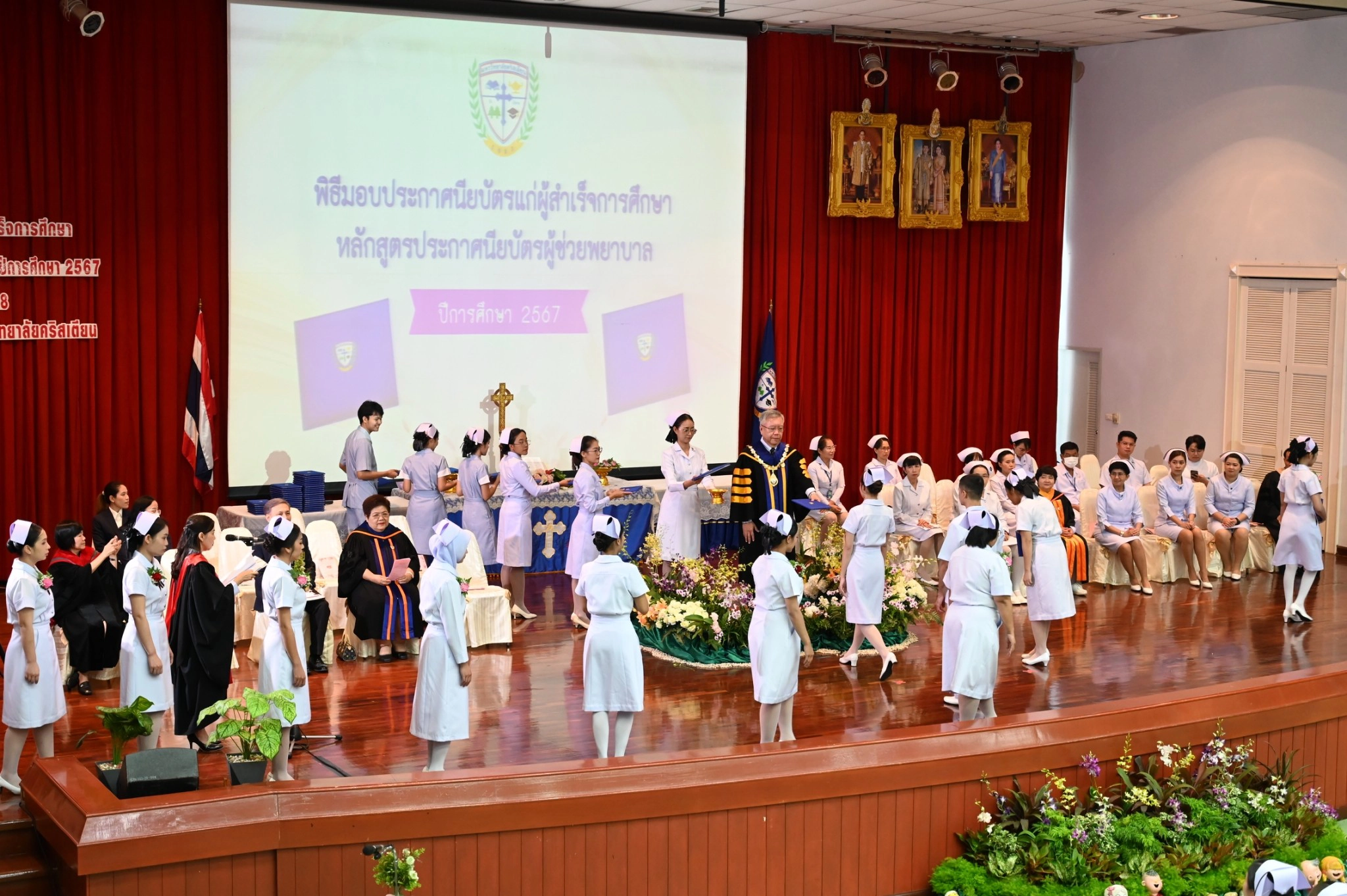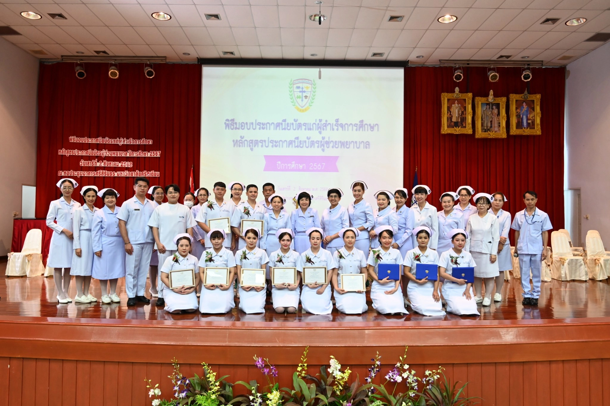 คณะพยาบาลศาสตร์ มหาวิทยาลัยคริสเตียน จัดพิธีมอบประกาศนียบัตรแก่ผู้สำเร็จการศึกษาหลักสูตรประกาศนียบัตรผู้ช่วยพยาบาล ปีการศึกษา 2567 โดย ผู้ช่วยศาสตราจารย์ ดร.สุลักษมณ์ ภัทรธรรมมาศ อธิการบดีมหาวิทยาลัยคริสเตียน เป็นประธานในพิธีมอบประกาศนียบัตรแก่ผู้สำเร็จการศึกษา และผู้ช่วยศาสตราจารย์ ดร.เนตรชนก ศรีทุมมา คณบดีคณะพยาบาลศาสตร์ ได้ทำพิธีมอบหมวก แก่ผู้สำเร็จการศึกษาประกาศนียบัตรผู้ช่วยพยาบาล จำนวน 116 คน ในวันเสาร์ที่ 2 สิงหาคม พ.ศ. 2568 ณ ห้องประชุม อาคารศรีสิรินธร มหาวิทยาลัยคริสเตียน