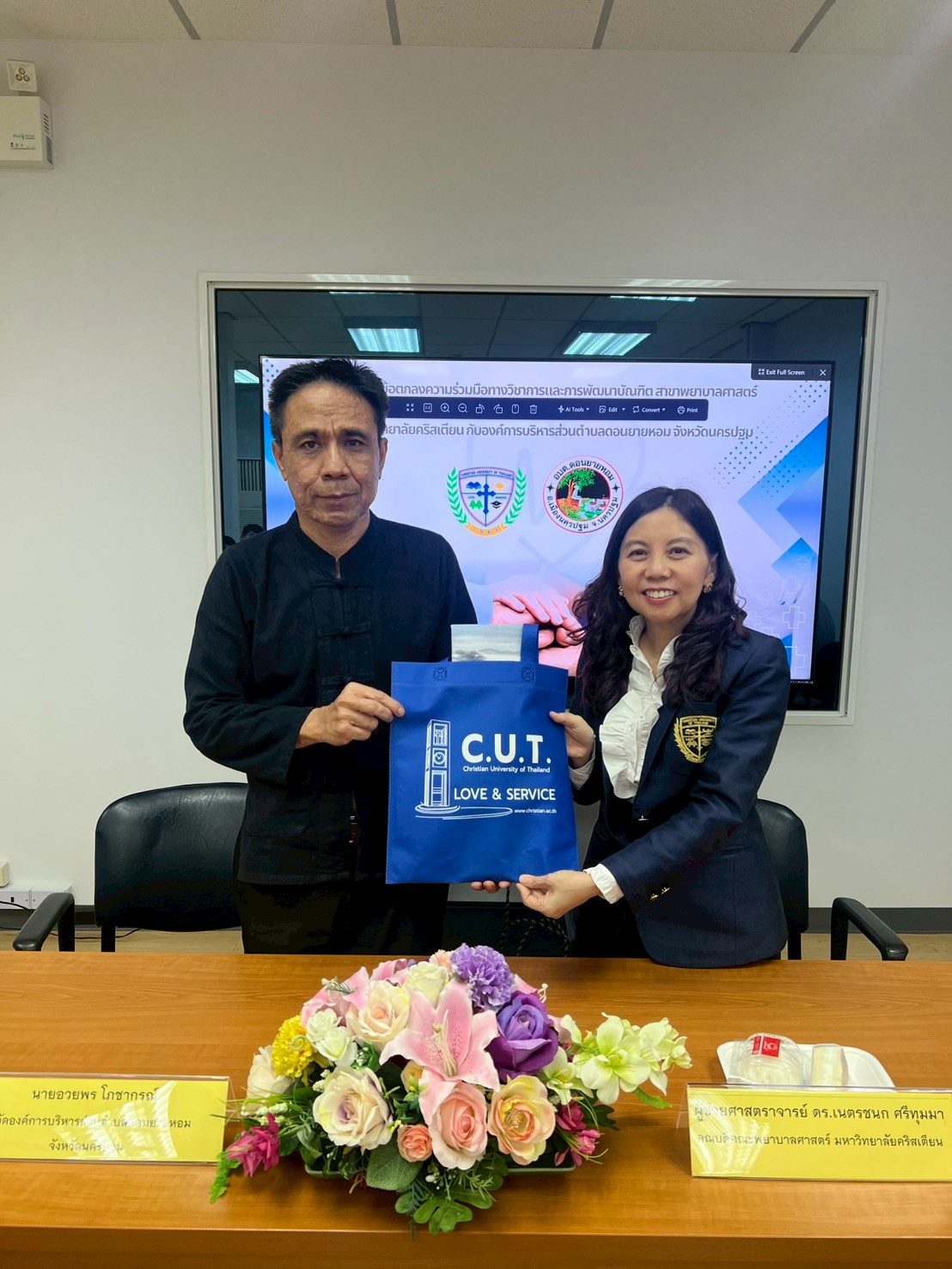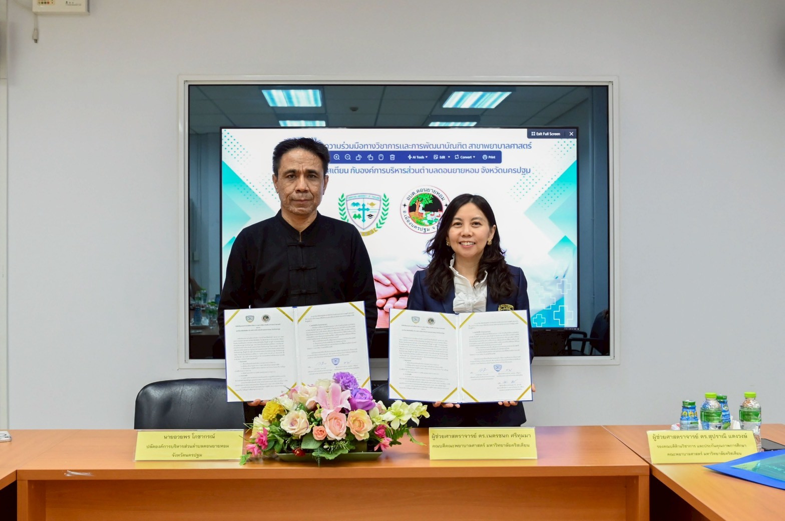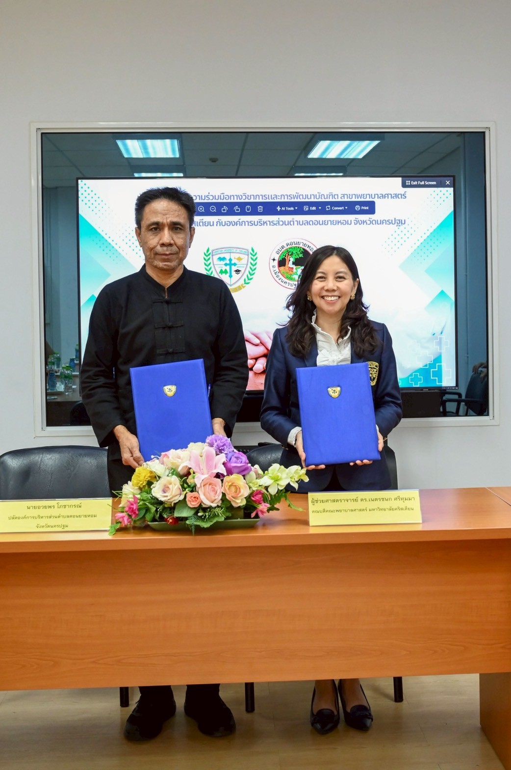The occasion marked the signing ceremony of the Memorandum of Understanding (MoU) on the Academic Service for Society Project and the MoU on Academic Collaboration and Graduate Development in Nursing Science between Christian University of Thailand and Don Yai Hom Subdistrict Administrative Organization This collaboration aims to promote and support academic service initiatives for society, enhance academic cooperation, develop the competencies of nursing personnel, and foster the creation of scholarly works and nursing innovations. The ceremony was held at the College of Nursing Conference Room, Srisirindhorn Building, Christian University of Thailand.