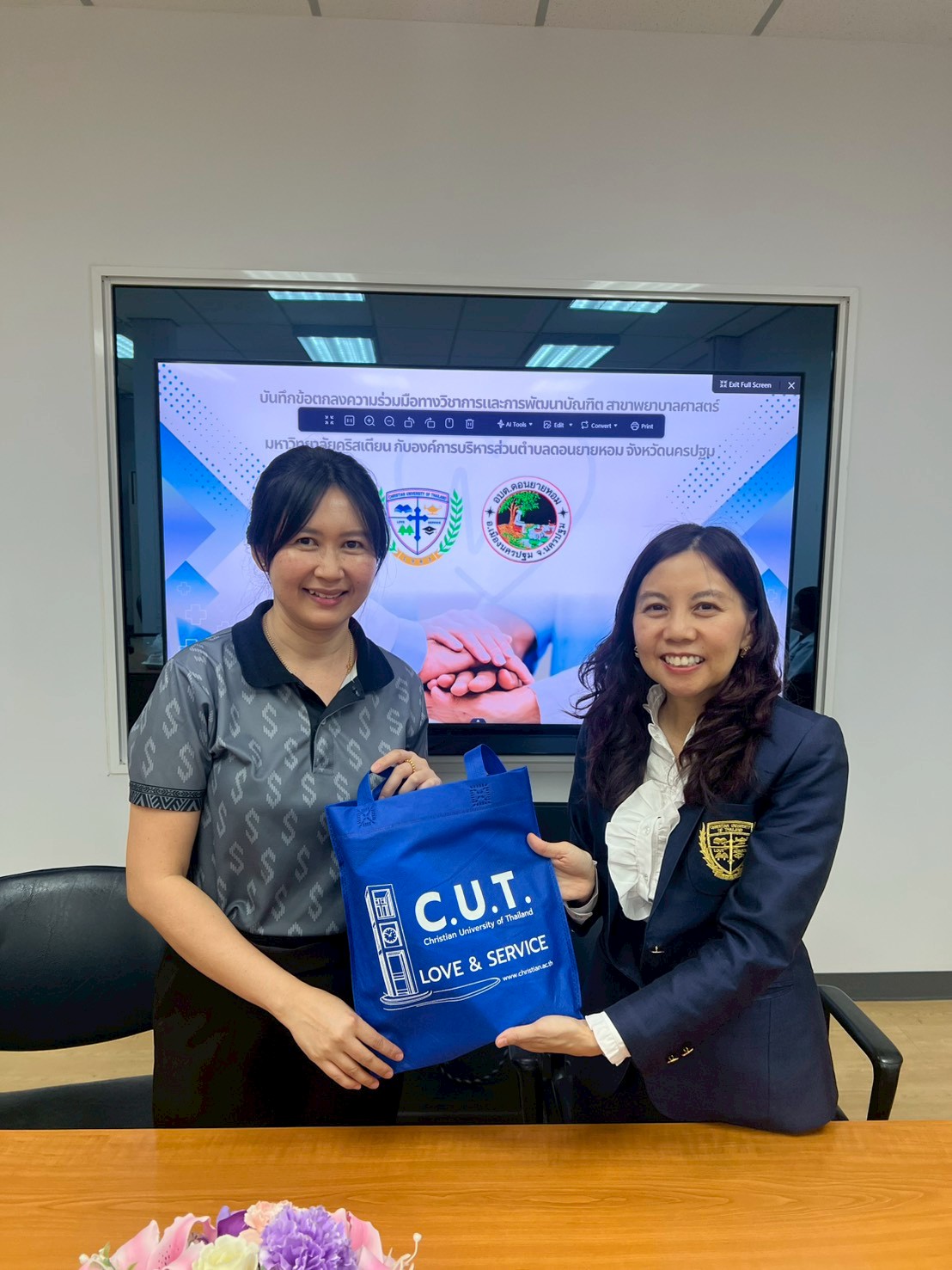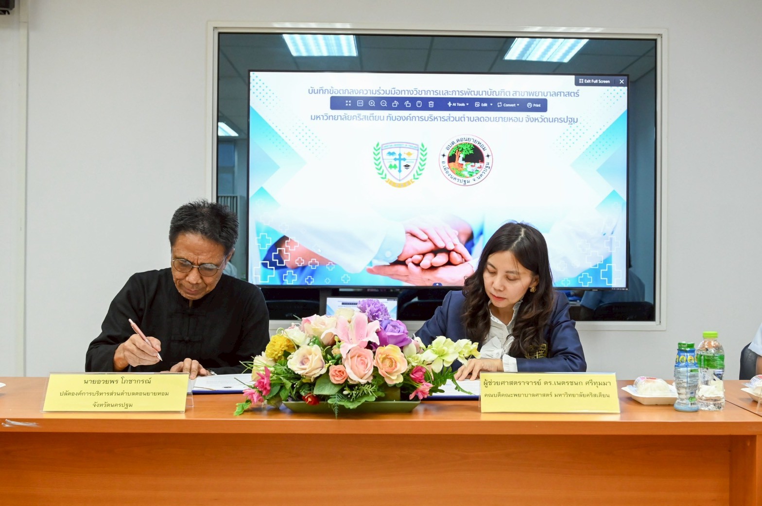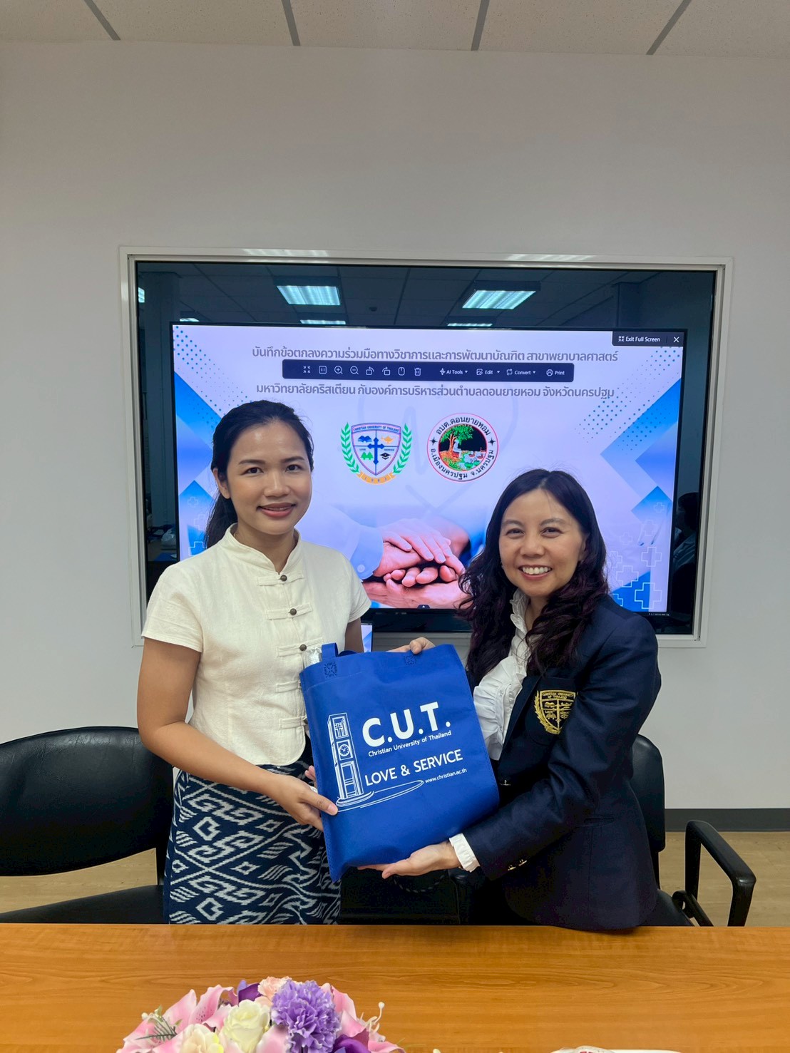 The occasion marked the signing ceremony of the Memorandum of Understanding (MoU) on the Academic Service for Society Project and the MoU on Academic Collaboration and Graduate Development in Nursing Science between Christian University of Thailand and Don Yai Hom Subdistrict Administrative Organization This collaboration aims to promote and support academic service initiatives for society, enhance academic cooperation, develop the competencies of nursing personnel, and foster the creation of scholarly works and nursing innovations. The ceremony was held at the College of Nursing Conference Room, Srisirindhorn Building, Christian University of Thailand.