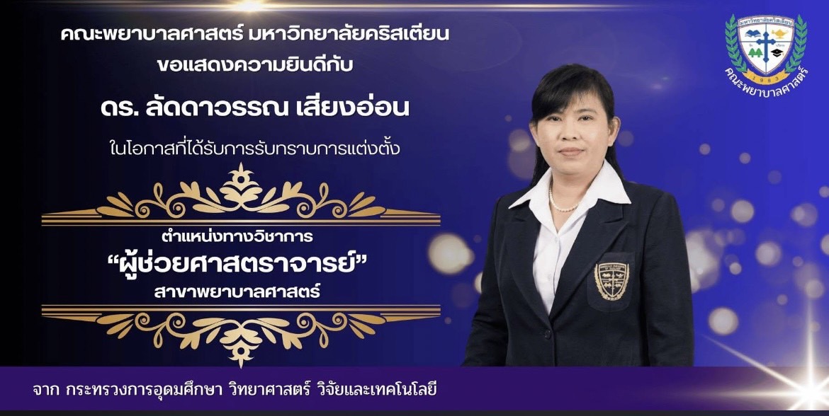 คณะพยาบาลศาสตร์ มหาวิทยาลัยคริสเตียน ขอแสดงความยินดีกับ ผู้ช่วยศาสตราจารย์ ดร. ลัดดาวรรณ เสียงอ่อน อาจารย์คณะพยาบาลศาสตร์ ที่ได้รับอนุมัติแต่งตั้งจาก กระทรวงการอุดมศึกษา วิทยาศาสตร์ วิจัยและเทคโนโลยี เป็น ” ผู้ช่วยศาสตราจารย์ ” สาขาพยาบาลศาสตร์ ขอแสดงความยินดีด้วยอย่างยิ่ง