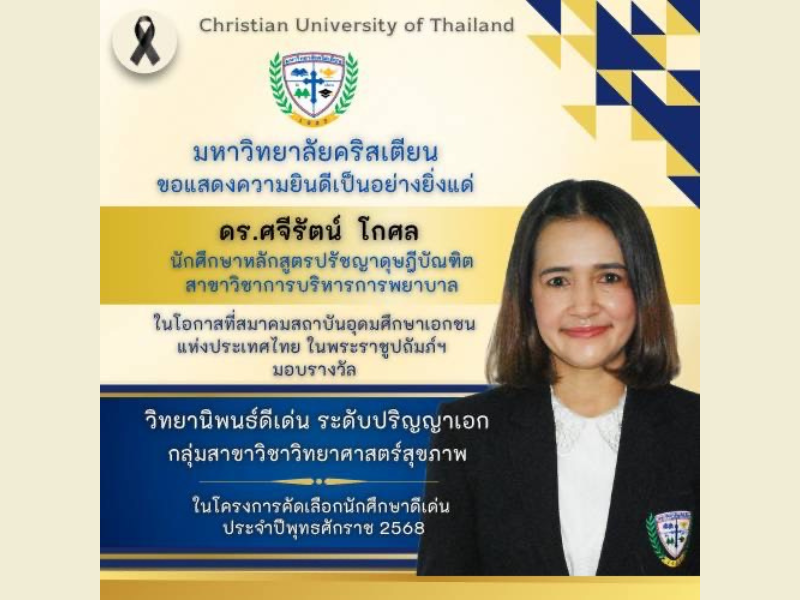 นักศึกษาหลักสูตรปรัชญาดุษฎีบัณฑิต สาขาวิชาการบริหารการพยาบาล ดร. ศจีรัตน์ โกศล ที่ได้รับรางวัลวิทยานิพนธ์ดีเด่น ระดับปริญญาเอก กลุ่มสาขาวิชาวิทยาศาสตร์สุขภาพ ในโครงการคัดเลือกนักศึกษาดีเด่น ประจำปี 2568 จากสมาคมสถาบันอุดมศึกษาเอกชนแห่งประเทศไทย ในพระราชูปถัมภ์ สมเด็จพระเทพรัตนราชสุดาฯ สยามบรมราชกุมารี