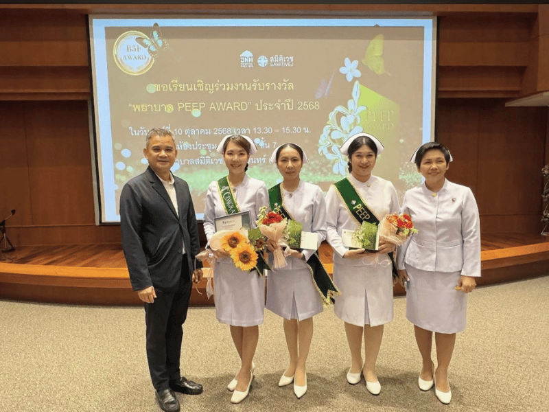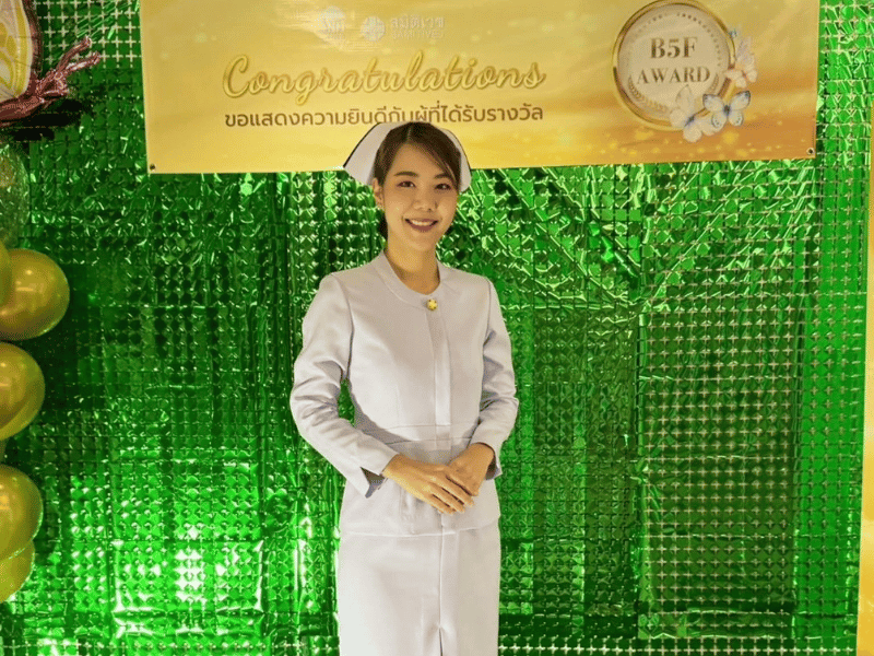Ms. Prangnalin Peeraputtiwet (Student ID 510xxx), an alumna of the Bachelor of Nursing Program (BNS Program) at the College of Nursing, has been honored with the “B5F Award” from Samitivej Sriracha Hospital. She currently serves as a Professional Nurse in the Internal Medicine Outpatient Department (OPD) at Samitivej Sriracha Hospital.