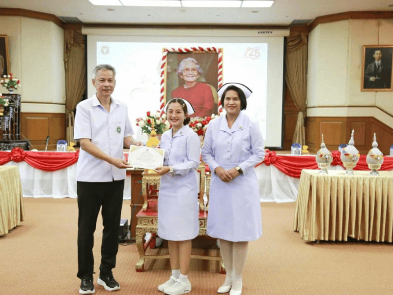 Ms. Sararat Inthanakom (Student ID 530xxx), an alumna of the Bachelor of Nursing Program (BNS Program) at the College of Nursing, has been honored with the “Outstanding Academic Nurse Award” from Ranong Hospital. She currently serves as a Professional Nurse in the Special Ward 1 Department at Ranong Hospital.