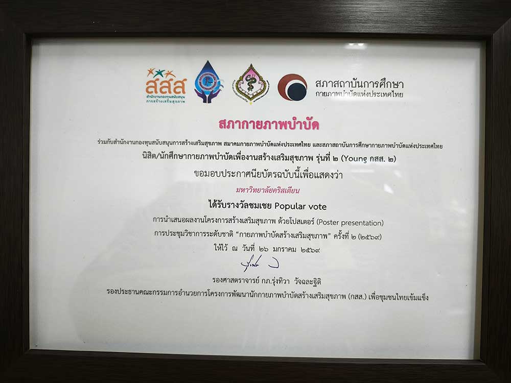ทีมนักศึกษาสาขาวิชากายภาพบำบัด มหาวิทยาลัยคริสเตียน ได้แก่ นายรพี รติสราญจิต นายกษมา ปกรณ์ นายจีรยุทธ ชาญประกอบ นายดนัยณัฏฐ์ อาโน และนางสาวสุชัญญา จันทร์วัฒนะ ภายใต้การดูแลของอาจารย์ที่ปรึกษา อ.กภ.หทัยชนก หมากผิน ได้รับรางวัลชมเชย Popular Vote จากการนำเสนอผลงานโครงการสร้างเสริมสุขภาพด้วยโปสเตอร์ ในงานประชุมวิชาการระดับชาติ “กายภาพบำบัดสร้างเสริมสุขภาพ” ครั้งที่ 2 ภายใต้โครงการพัฒนานักกายภาพบำบัดสร้างเสริมสุขภาพ (กสส.) เพื่อชุมชนไทยเข้มแข็ง เมื่อวันที่ 26 มกราคม พ.ศ. 2569 ณ โรงแรมอมารี ดอนเมือง แอร์พอร์ต กรุงเทพฯ