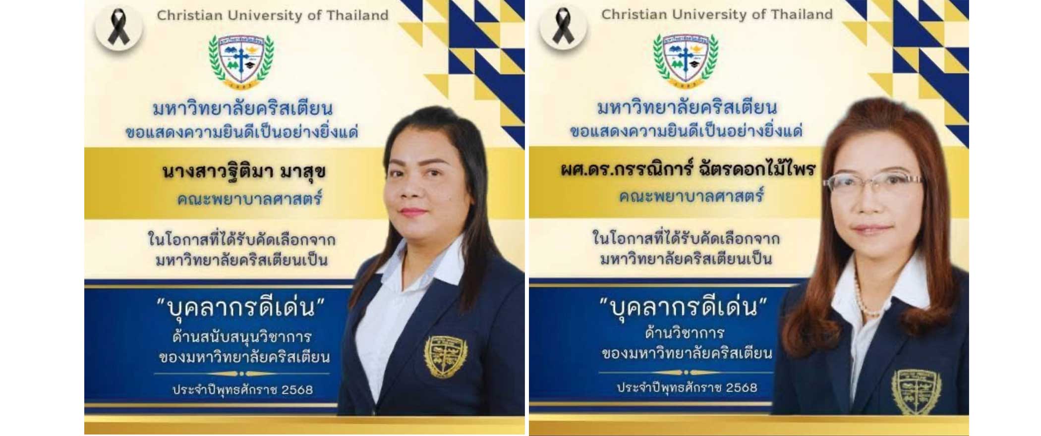 The College of Nursing at Christian University of Thailand extends its heartfelt congratulations to two distinguished staff members honored with the university’s Outstanding Staff Awards. Assistant Professor Dr. Kannikar Chatdokmaiprai has been recognized with the Outstanding Academic Staff Award for her exceptional contributions to scholarly excellence, while Ms. Thitima Masuk has received the Outstanding Academic Support Staff Award for her dedicated efforts in academic support systems.