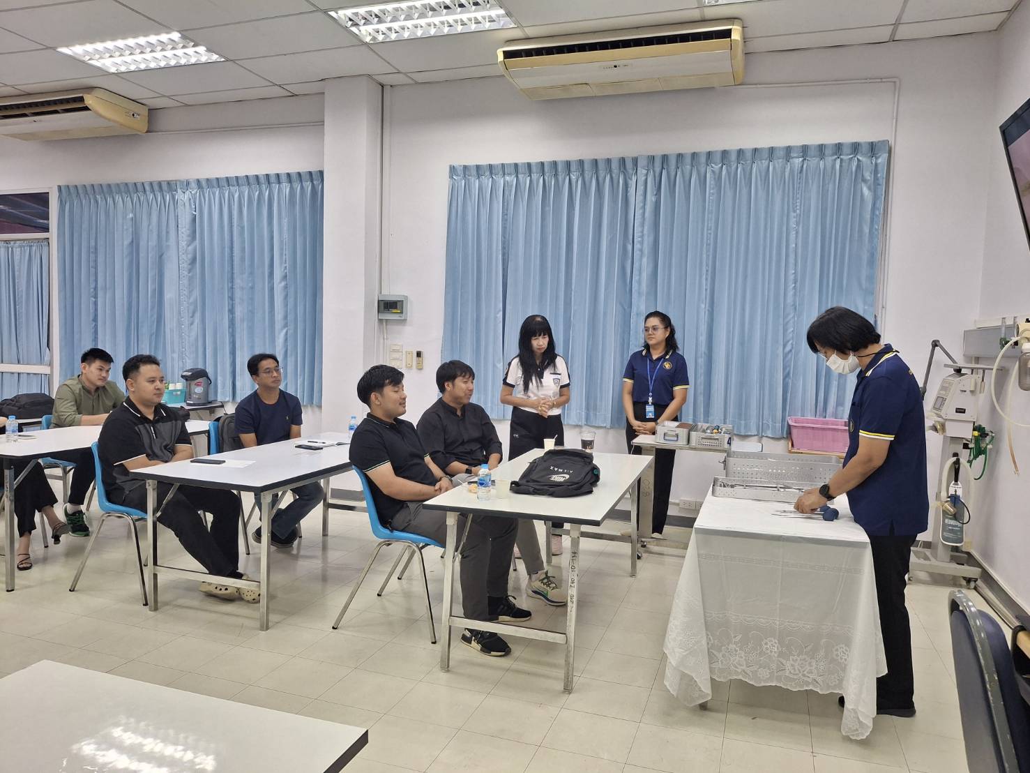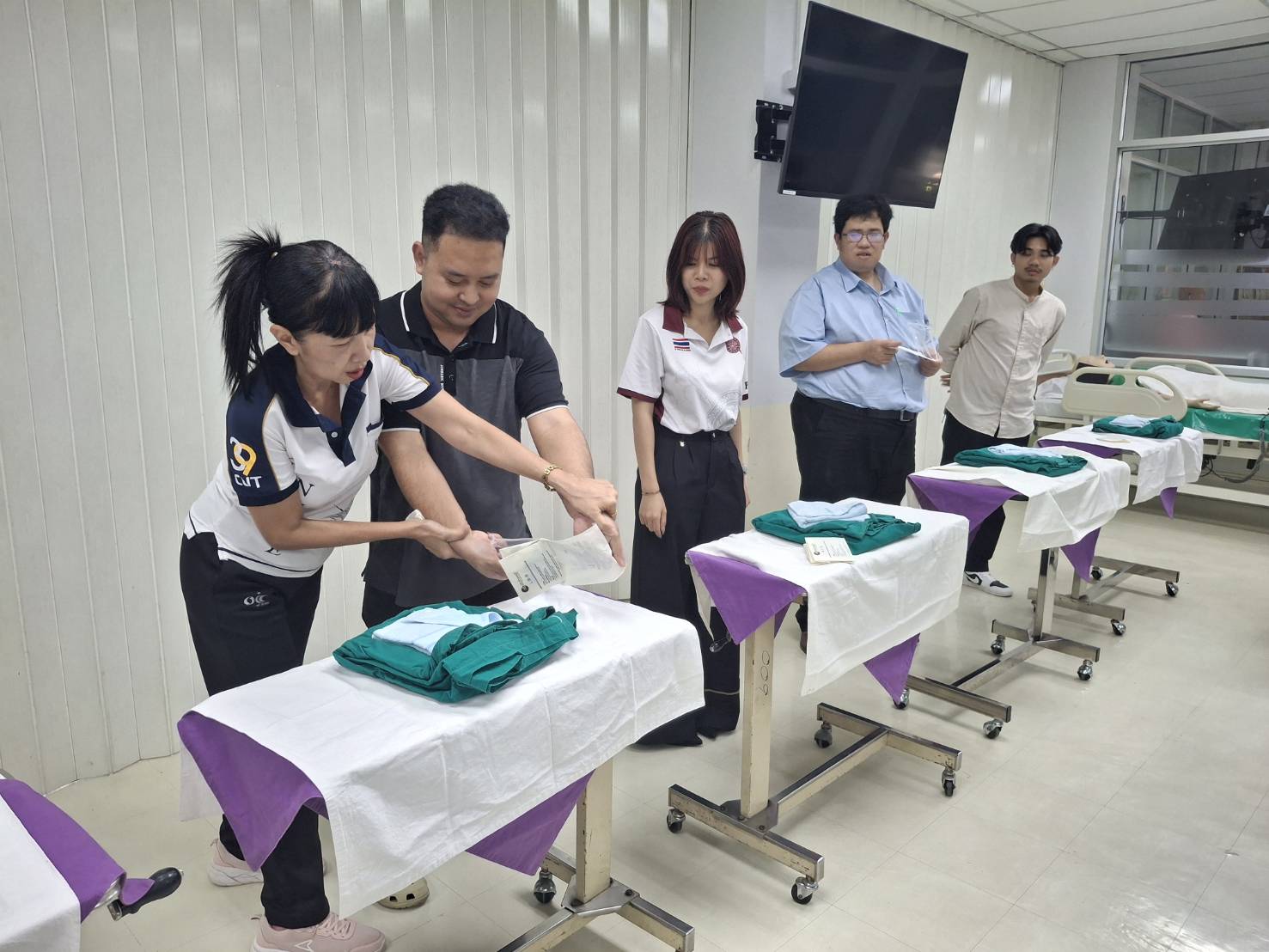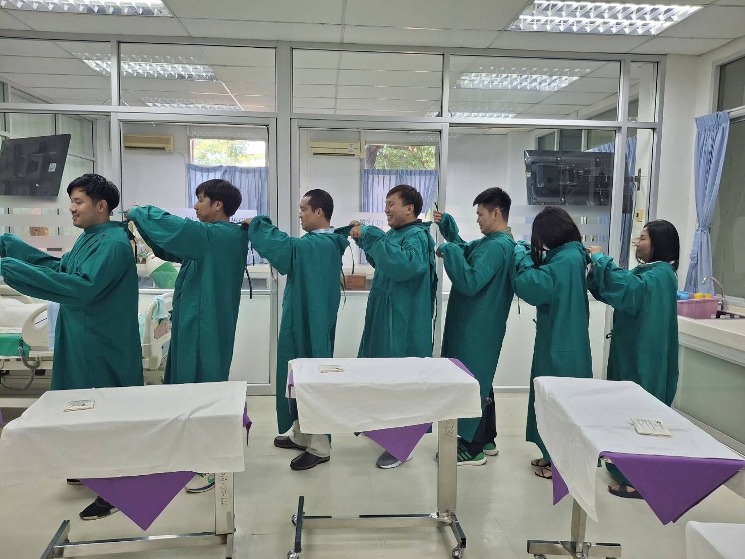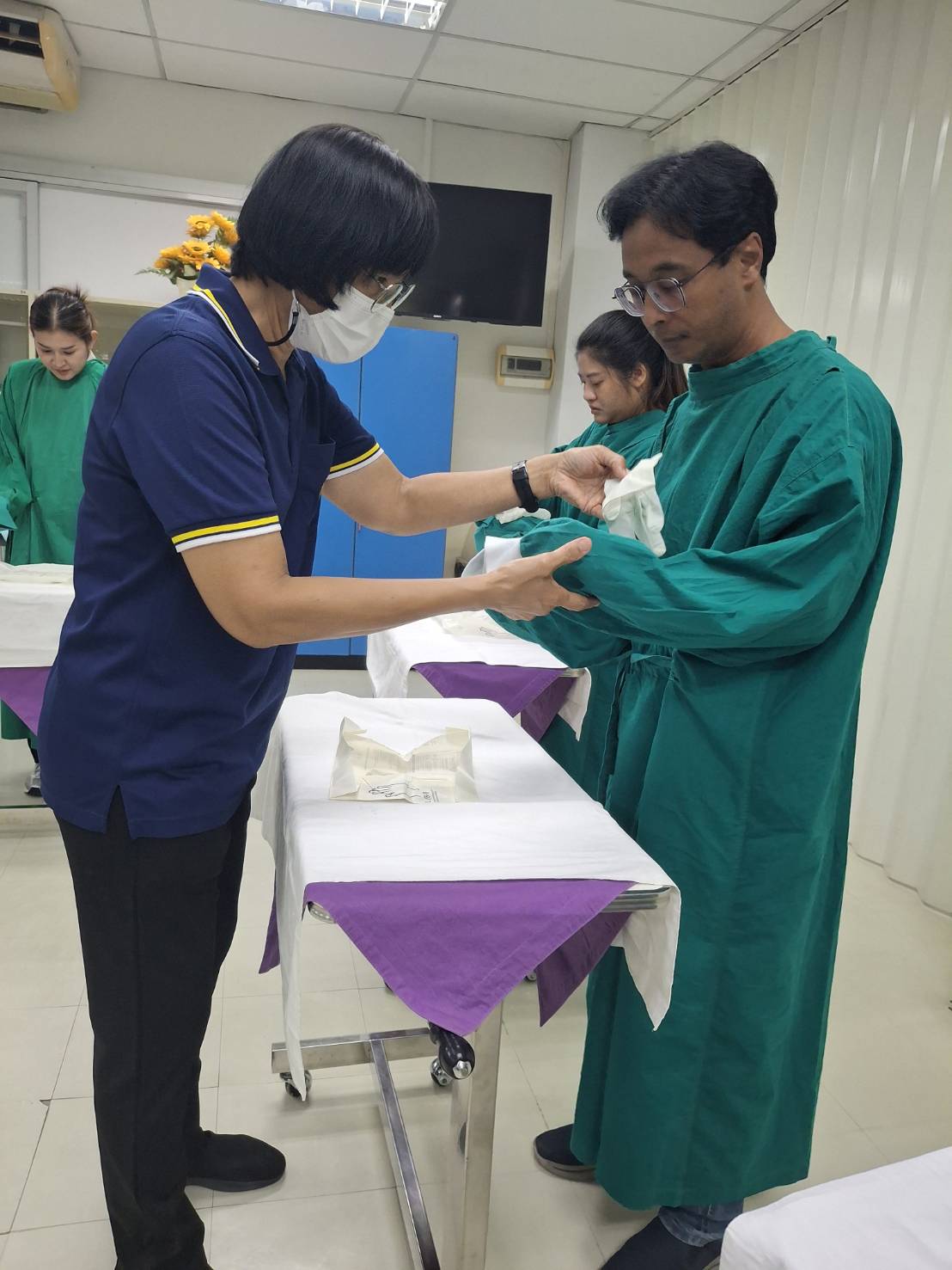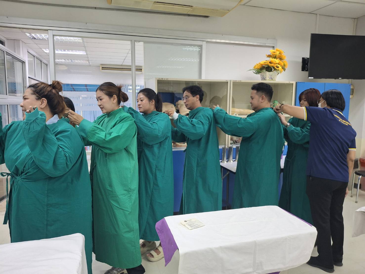 On Saturday, September 13, 2025, the College of Nursing and Administration Section was approved to organize a workshop on “Sterile Techniques to Increase Knowledge and Competence of Personnel in the Workplace” (Operation Theatre Sterilization Technique Basic Course). The objective is to develop skills and knowledge in basic operating room sterile techniques for personnel of medical equipment companies. There were a total of 16 participants in the project: 13 participants from Medical Creation Co., Ltd. (Head Office), 2 participants from Digital Orthopedic Solution Co., Ltd., and 1 participant from Thai Olba Healthcare Co., Ltd. (Head Office). Asst. Prof. Dr. Netchanok Sritoomma, Dean of the College of Nursing, gave the opening speech for the project, and participants listened to the lecture and participated in training in sterile operating room techniques led by four experienced nursing instructors and nurses serving as lecturers.