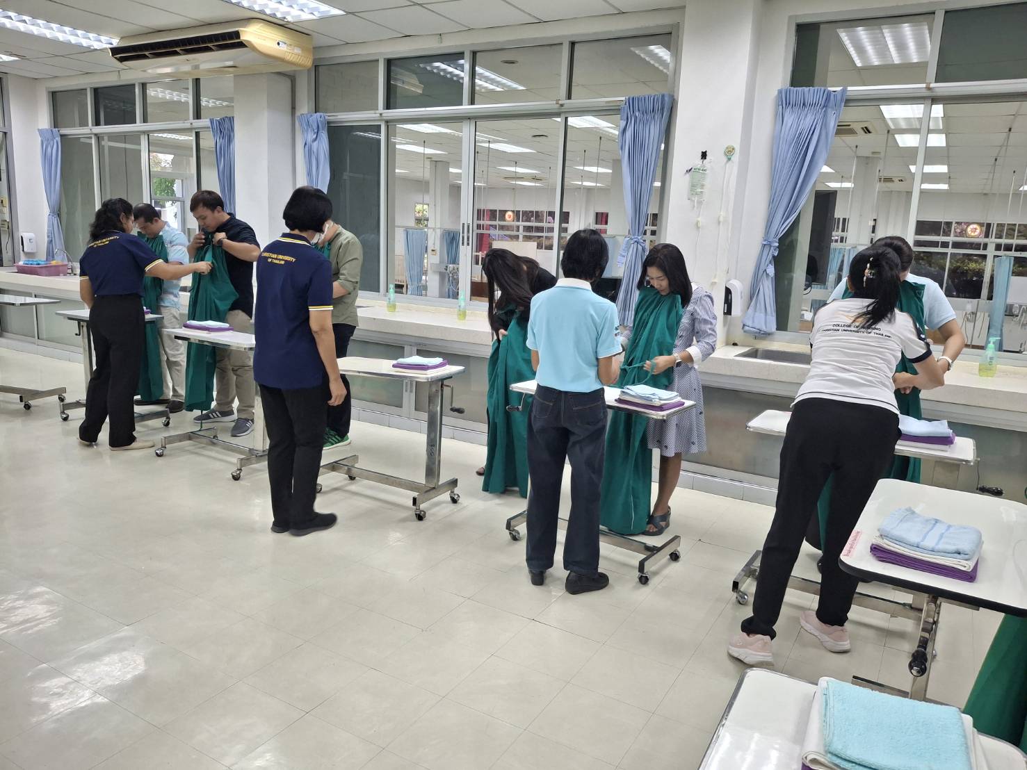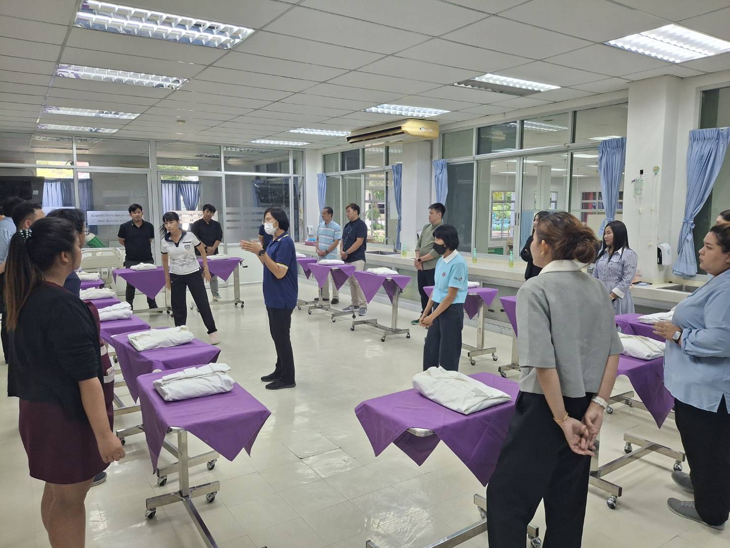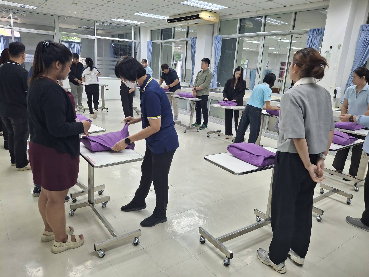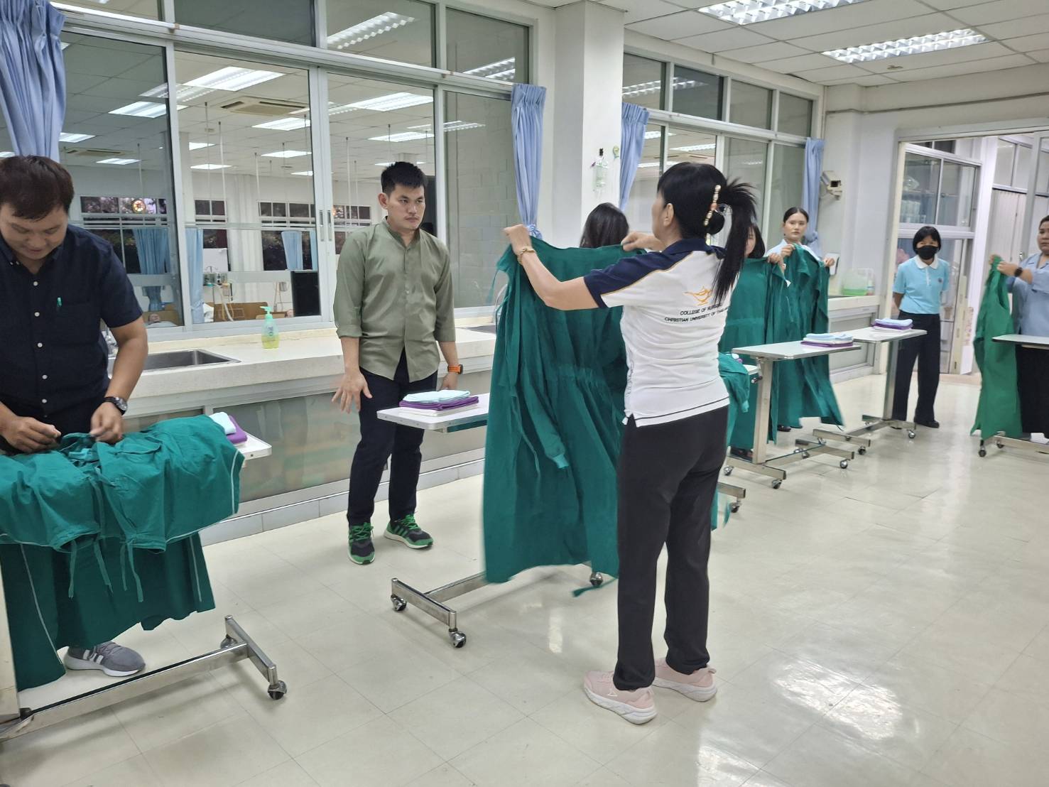 On Saturday, September 13, 2025, the College of Nursing and Administration Section was approved to organize a workshop on “Sterile Techniques to Increase Knowledge and Competence of Personnel in the Workplace” (Operation Theatre Sterilization Technique Basic Course). The objective is to develop skills and knowledge in basic operating room sterile techniques for personnel of medical equipment companies. There were a total of 16 participants in the project: 13 participants from Medical Creation Co., Ltd. (Head Office), 2 participants from Digital Orthopedic Solution Co., Ltd., and 1 participant from Thai Olba Healthcare Co., Ltd. (Head Office). Asst. Prof. Dr. Netchanok Sritoomma, Dean of the College of Nursing, gave the opening speech for the project, and participants listened to the lecture and participated in training in sterile operating room techniques led by four experienced nursing instructors and nurses serving as lecturers.