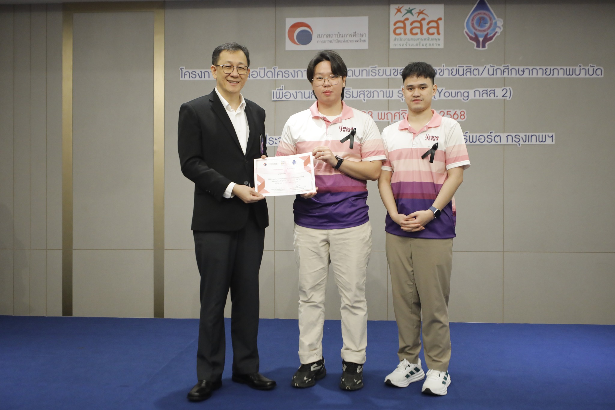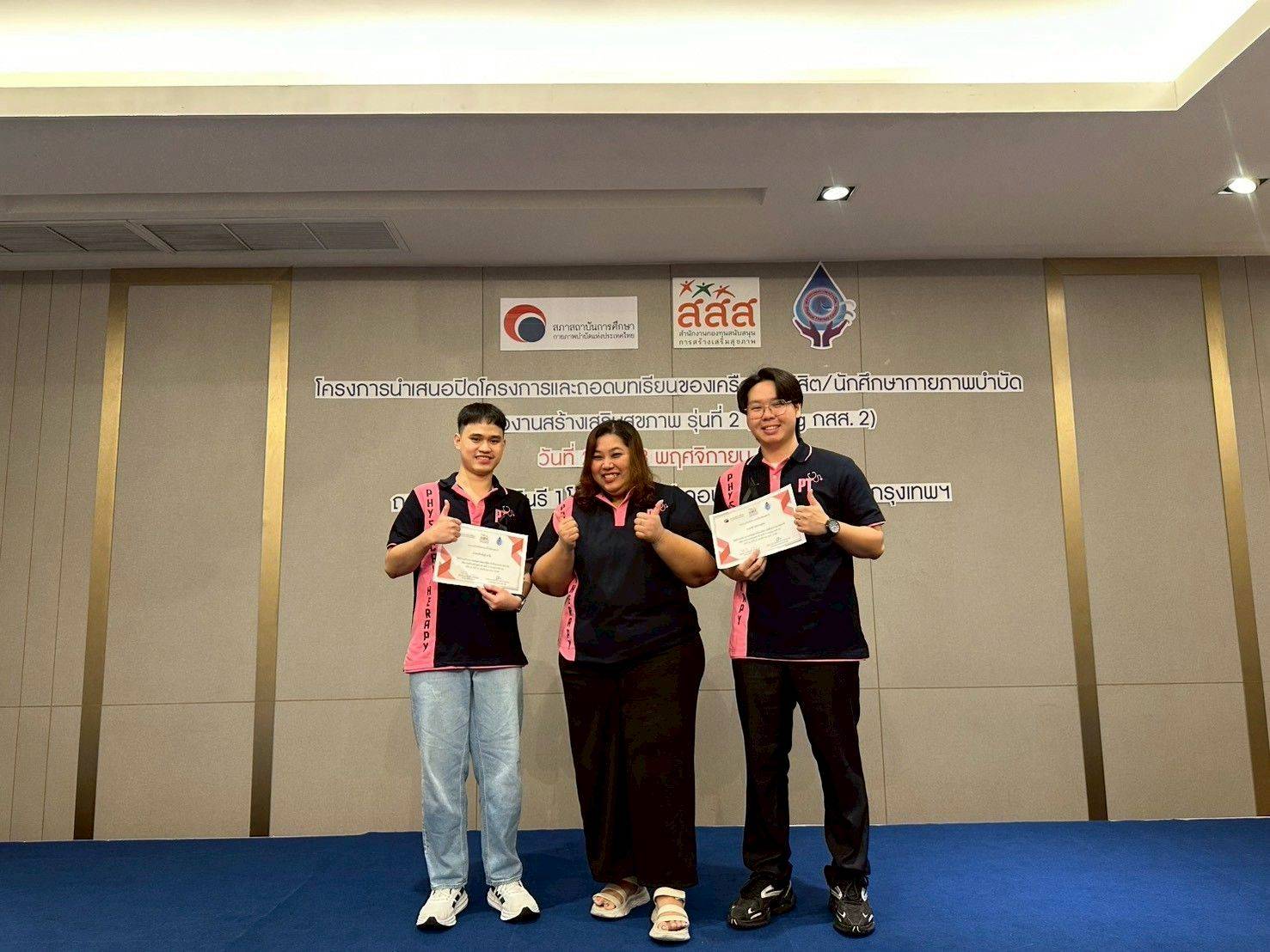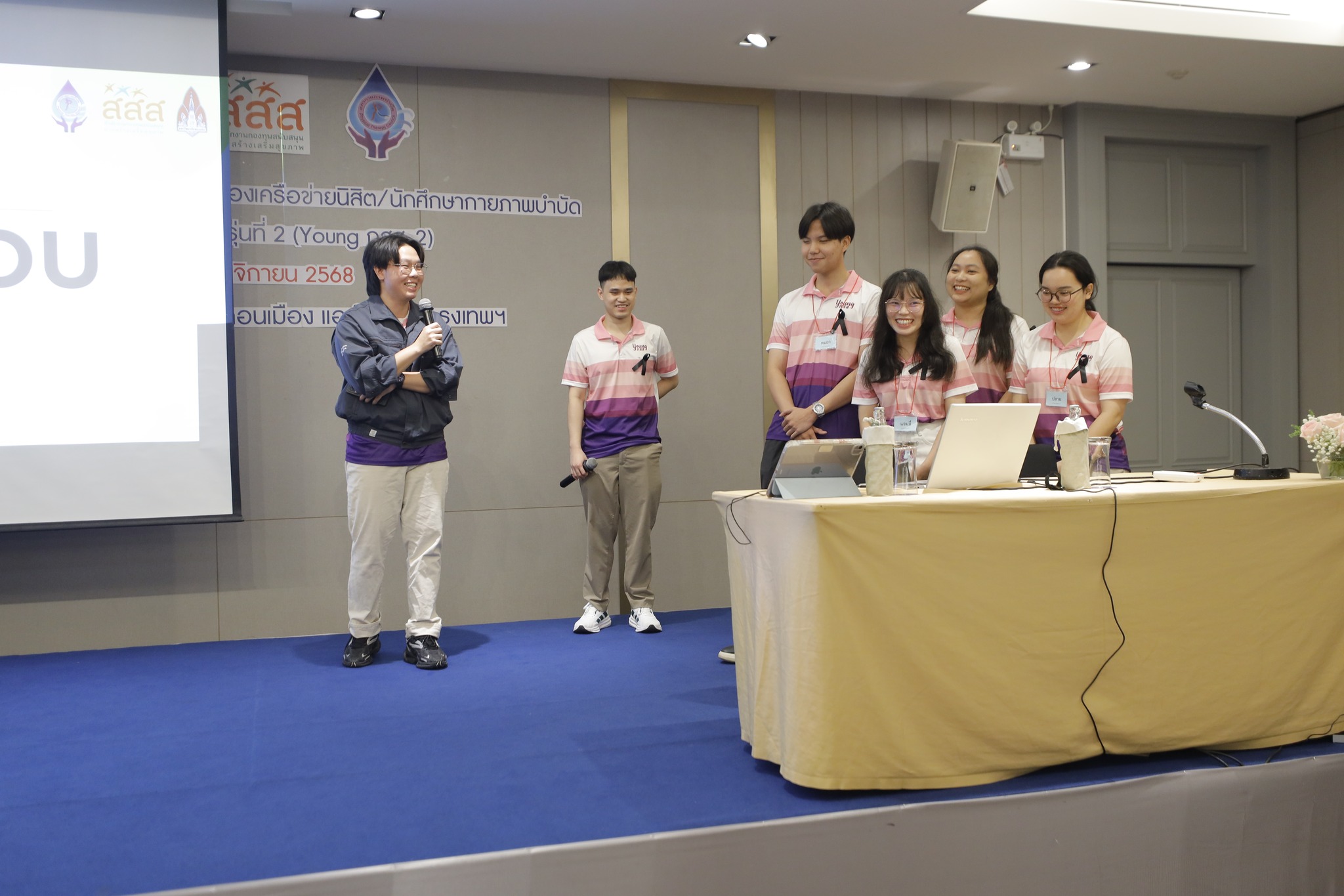 ในงานนี้ นศก.รพี รติสราญจิต และ นศก.ดนัยณัฏฐ์ อาโน เป็นตัวแทนร่วมเวทีนำเสนอผลงานเชิงวิชาการ ถ่ายทอดผลลัพธ์และบทเรียนการดำเนินงานต่อเครือข่ายนักศึกษาทั่วประเทศ สะท้อนถึงศักยภาพของนักศึกษากายภาพบำบัดรุ่นใหม่ในการเป็น ผู้นำการเปลี่ยนแปลงด้านสุขภาพ (Change Agent)