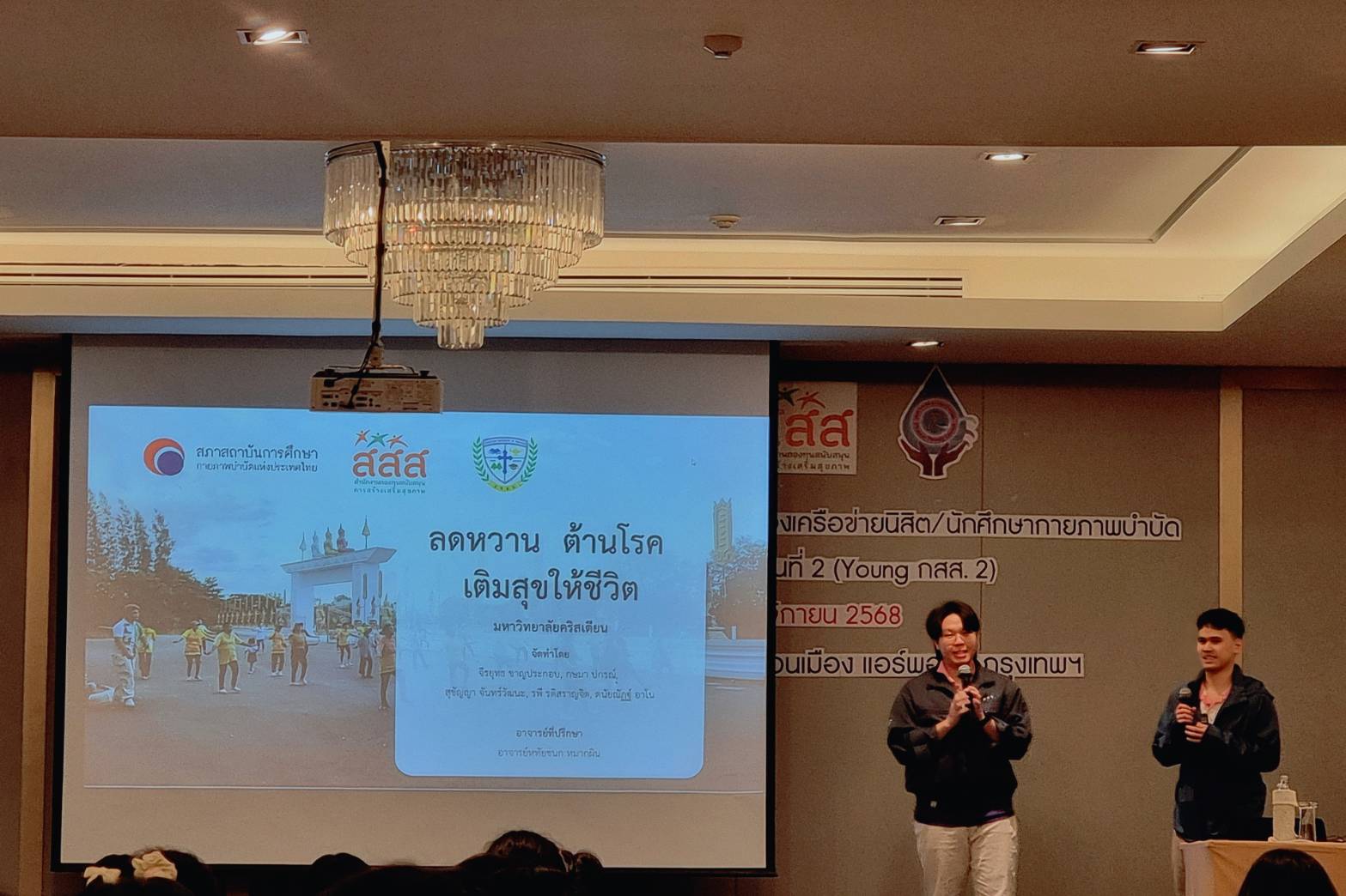 นักศึกษาสาขาวิชากายภาพบำบัด คณะวิทยาศาสตร์สุขภาพ มหาวิทยาลัยคริสเตียน เข้าร่วมเวทีนำเสนอผลงานสร้างเสริมสุขภาพ ในกิจกรรมปิดโครงการและถอดบทเรียนของเครือค่ายนิสิต/นักศึกษากายภาพบำบัดเพื่องานสร้างเสริมสุขภาพ รุ่นที่ 2 (Young กสส.2) ซึ่งจัดโดยสภากายภาพบำบัด ร่วมกับ สำนักสนับสนุนการพัฒนาระบบสุขภาพ (สำนัก 7) สำนักงานกองทุนสนับสนุนการสร้างเสริมสุขภาพ (สสส.) โดยมีนักศึกษาจาก 16 สถาบันทั่วประเทศเข้าร่วมแลกเปลี่ยนเรียนรู้ และถอดบทเรียนโครงการอย่างเข้มข้น